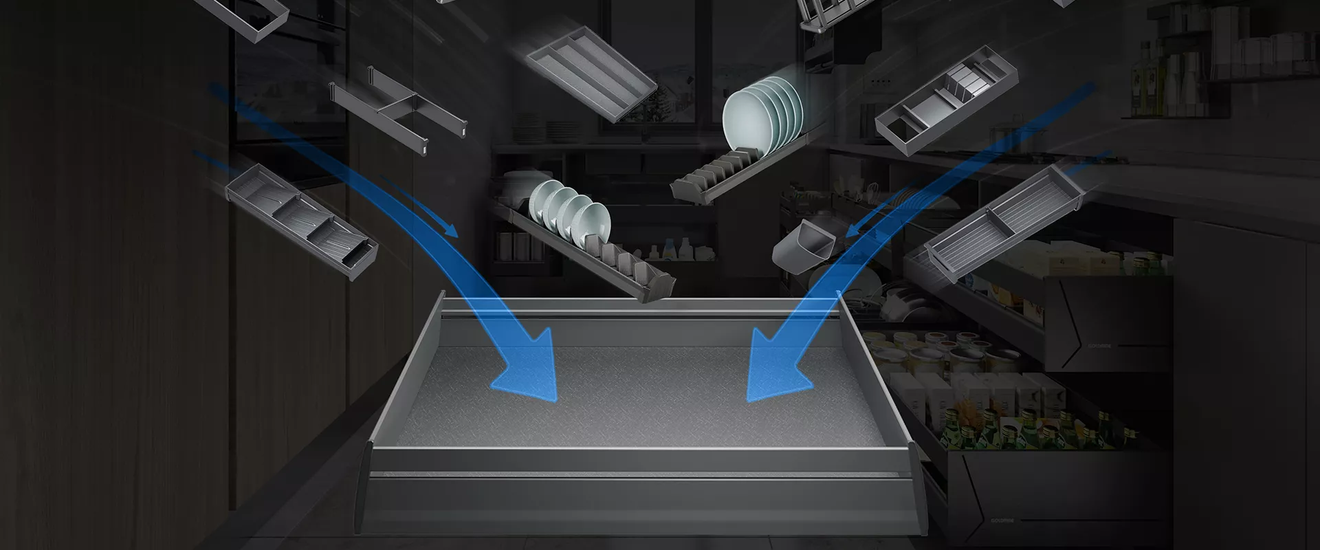 设计是Goldmine品牌的核心,探索、突破、极致的人性化是Goldmine创新的原动力。以使用者为中心的产品设计,构建更整洁、有序和美好的厨房生活与使用者共同参与构建厨房生活是Goldmine产品鲜明的个性特征。尊重使用者的本源需求,持续倾听和解析使用者真正所需,产品可灵活多变,丰富的功能收纳模块,百变组合,可以同时满足东西南北用户的家庭收纳需求。极光系列-随心抽厨房拉篮系统在材质应用方面...